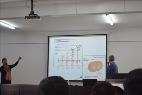 培訓(xùn)會上,Harrie先生對馬鈴薯規(guī)范化種植管理的重要意義進行了深刻闡述,并就馬鈴薯各生長周期內(nèi)易發(fā)、頻發(fā)的病蟲害及其防治措施與馬鈴薯種植、生產(chǎn)全程現(xiàn)代化管理等內(nèi)容進行了講解,理論聯(lián)系實際,內(nèi)容詳實全面,得到了參訓(xùn)學(xué)員的廣泛認(rèn)可。培訓(xùn)全程為英語授課,為了使參訓(xùn)學(xué)員能夠真正聽得懂、學(xué)得會,公司特聘內(nèi)蒙古農(nóng)業(yè)大學(xué)農(nóng)學(xué)專業(yè)教授進行了全程翻譯。